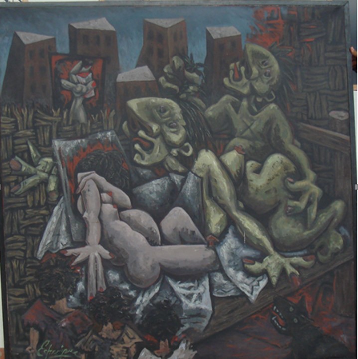es un cuadro de 1.50X1.50 con tonos grises propios del expresionismo, el